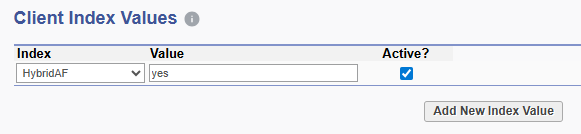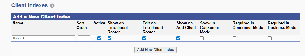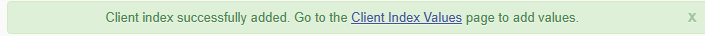 - Click the link to go to Client Index values at the top right or click the link below the Add New Client Index that appears