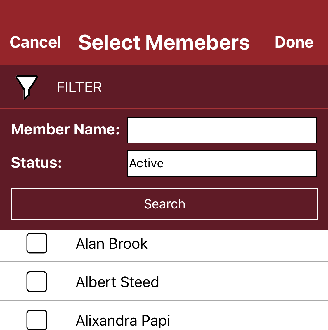 Shows a list of all members at your selected gym. Can select all or filter by status or names